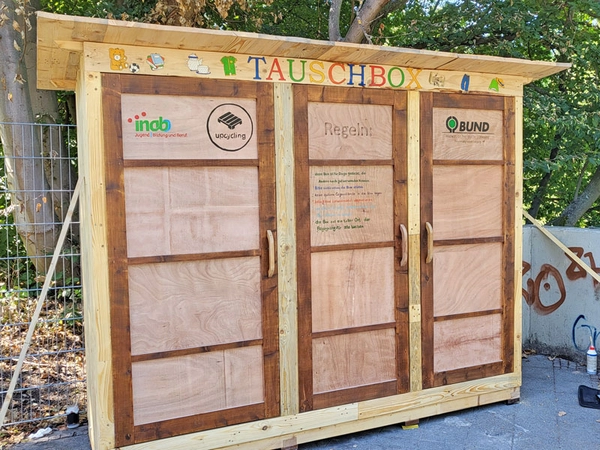 Die im Juli vollständig abgebrannte Tauschbox in Schleußig an der "Entenbrücke" konnte am 6. August 2024, durch eine Kooperation von BUND Leipzig und INAB Leipzig wieder aufgebaut werden. Somit ist es ab sofort wieder möglich, an diesem wichtigen Schleußiger Treffpunkt gut erhaltene Bücher, Kleidung oder sonstige Gegenstände abzulegen oder mitzunehmen. Basierend auf einer Tauschlogik können so wichtige Ressourcen geschützt werden.