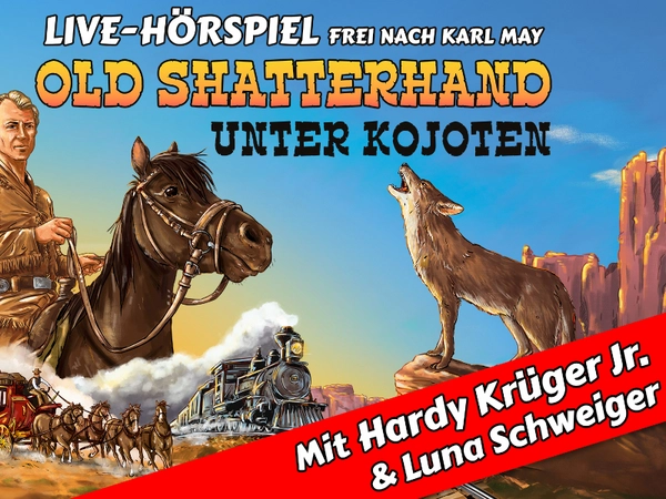 Mit „Old Shatterhand unter Kojoten“ kommt ein neuer, actionreicher Western als Live-Hörspiel auf die Bühne. Hardy Krüger Jr. spielt die Hauptrolle des Old Shatterhand, Volker Zack ist als Luke O’Hara zu erleben und Luna Schweiger verkörpert Emily Milton. Gemeinsam mit weiteren Schauspielern übernehmen sie insgesamt zwölf Rollen. Der Star des Abends ist jedoch der Geräuschemacher. Direkt auf der Bühne lässt er mit alltäglichen Gegenständen ganze Welten entstehen: knirschender Sand unter Stiefeln, galoppierende Pferde, knallende Schüsse oder das Knarren einer Postkutsche. Mit geübten Handgriffen, Fantasie und perfektem Timing verwandelt er einfache Materialien in lebendige Klangbilder und macht so das Kopfkino des Publikums perfekt. Gemeinsam schaffen sie ein spannendes Abenteuer voller Spannung, Tempo und Atmosphäre.
